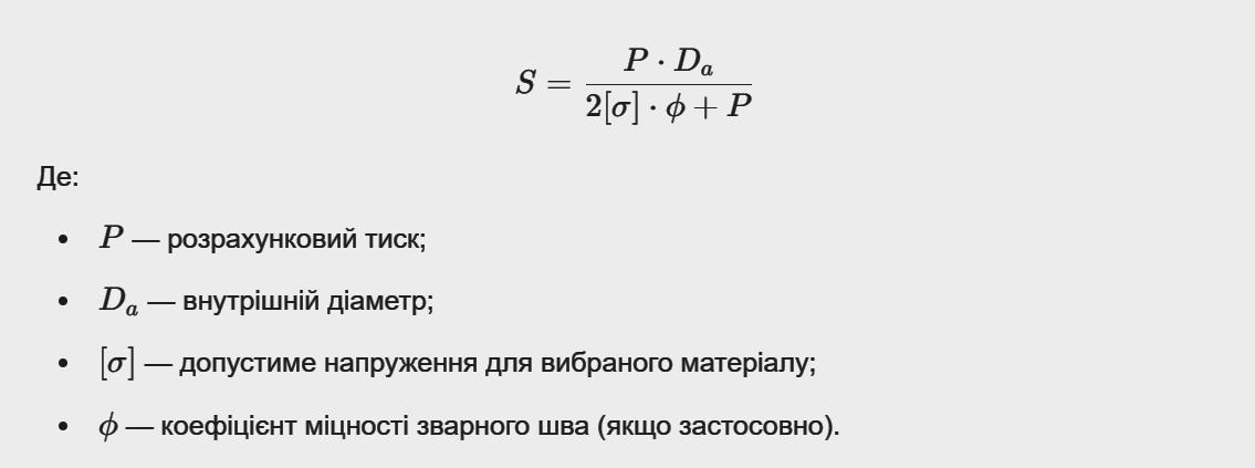 При виборі арматури експерт завжди перевіряє розрахункову міцність корпусу. Спрощена формула для розрахунку товщини стінки циліндричного корпусу (S):